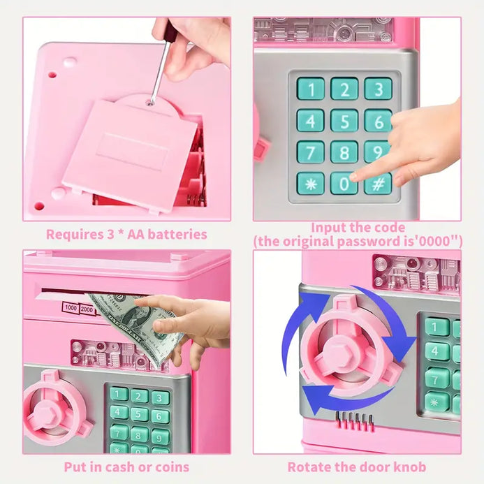 - Secure Password Protection: Equipped with a four-digit electronic password system, our piggy bank emits a sound if an incorrect password is entered. Unlockable only with the correct 4-digit code, the green light signals access, allowing the door to be opened by turning the knob clockwise. (Default: 0000, customizable passwords to suit your preference).