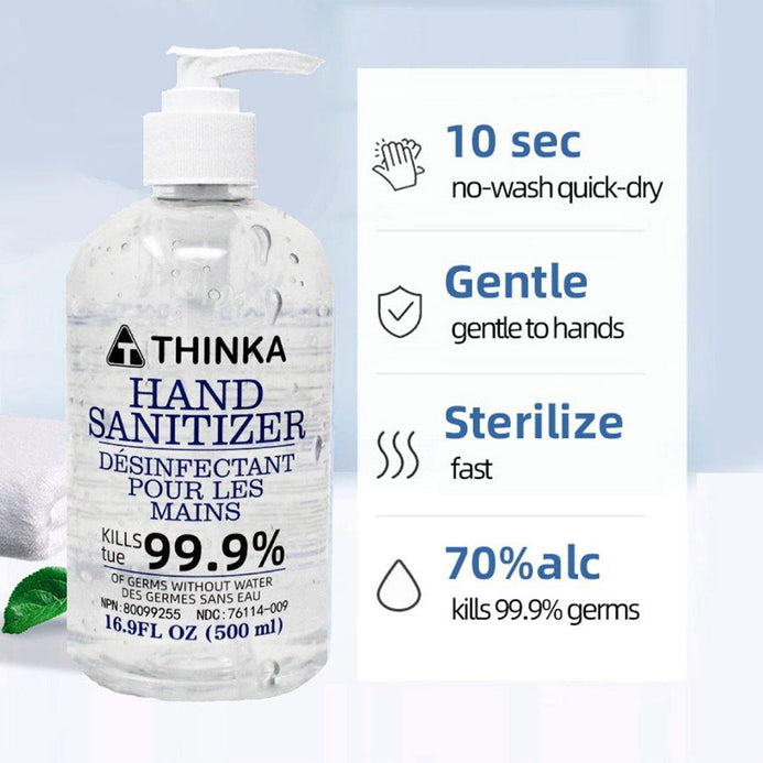 • Thinka Hand Sanitizer kills harmful bacteria and germs on contact. The formula requires no rinsing. Enriched with ingredients that moisturize, leaving your hands feeling soft and smooth without a sticky residue.