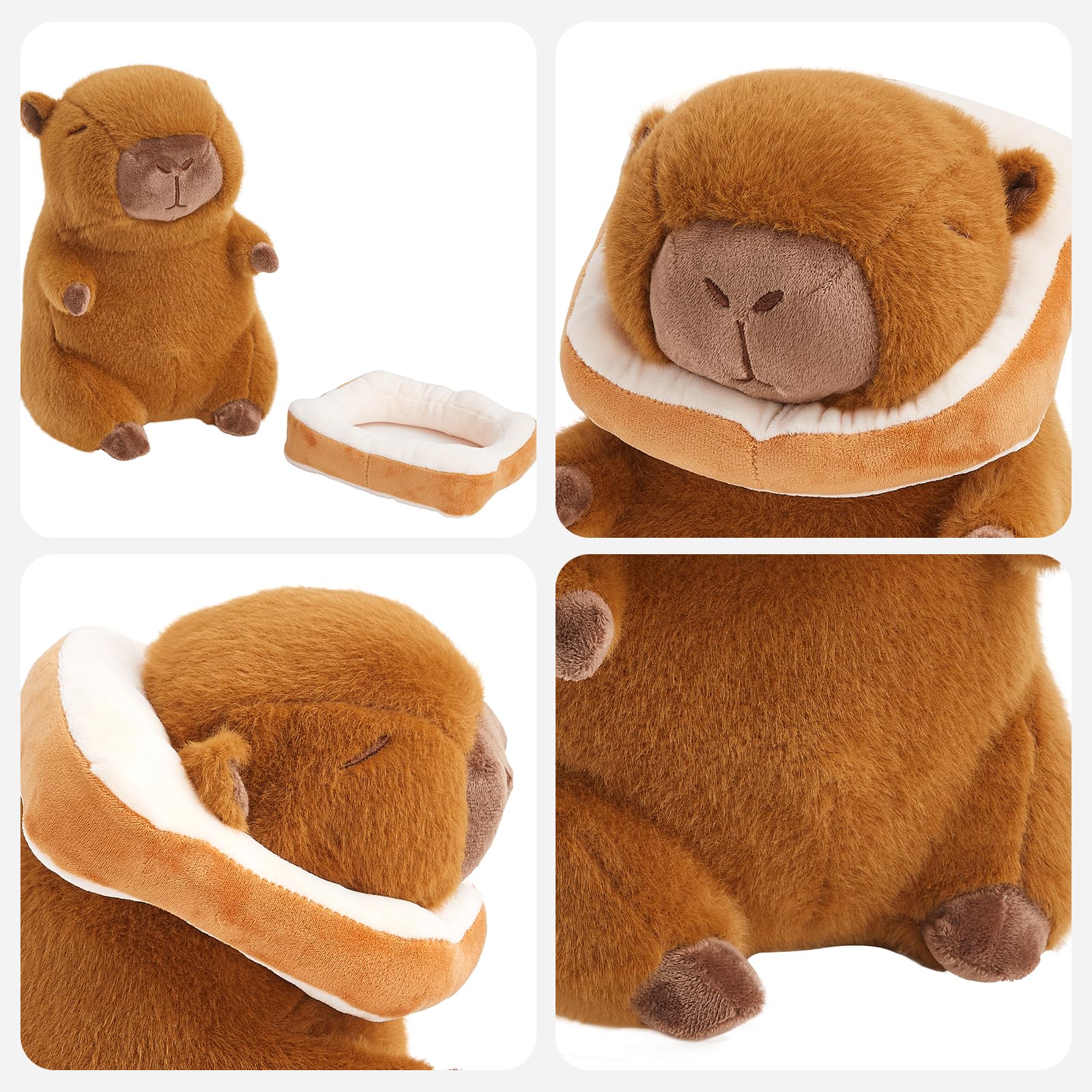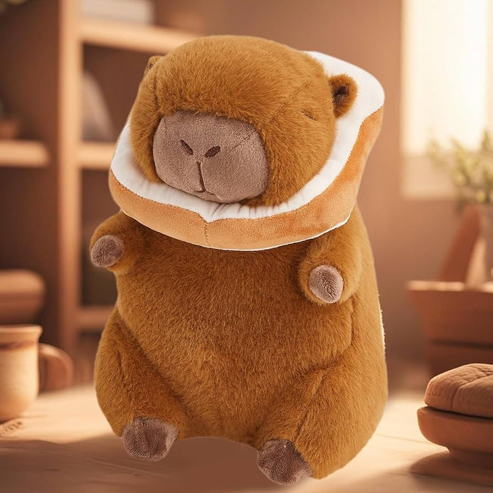 An adorable capybara plush with a cute bread detail around its neck. Soft, cozy, and perfect for cuddles.