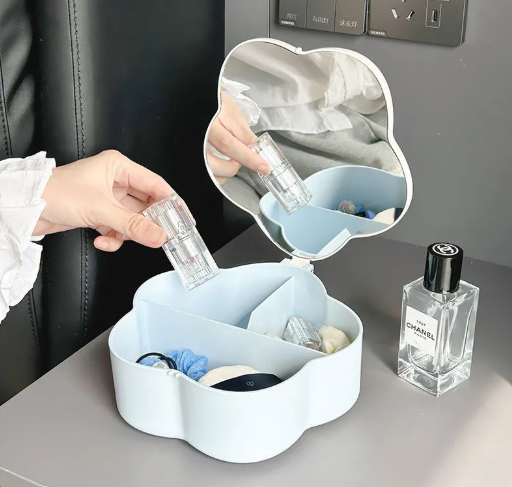 A flower-shaped storage box with a built-in mirror, perfect for makeup or everyday essentials.
